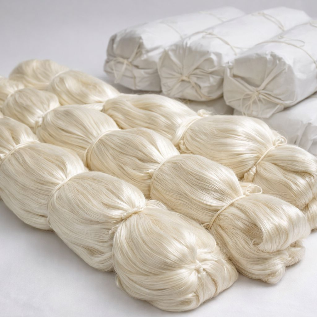 Raw Mulberry Silk No. 429 from Turkmenistan is a premium grade natural filament fiber produced by the Bombyx Mori silkworm. This silk is known for its exceptional luster, smooth texture, and superior tensile strength. Turkmenistan’s unique climate and traditional sericulture practices ensure that this silk maintain consistent fiber fineness, natural whiteness, and superior reeling quality, suitable for luxury textile and fabric applications.